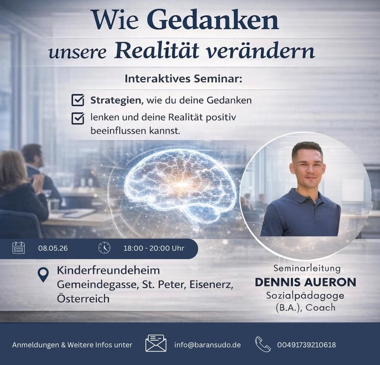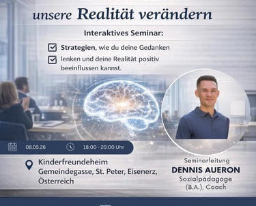 Lernen Sie einfache Strategien wie Sie mit Ihren Gedanken Ihre Realität verändern können. Aufbauend auf unser "Die 1 Minute" Seminar. Für Quereinsteiger jedoch auch leicht verständlich und nachvollziehbar, die zweite Seminarreihe in Österreich.